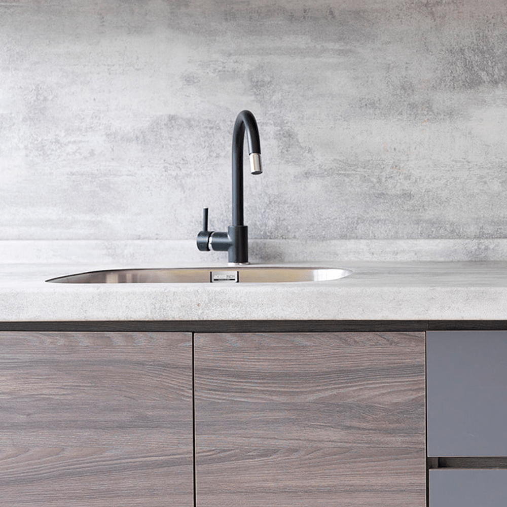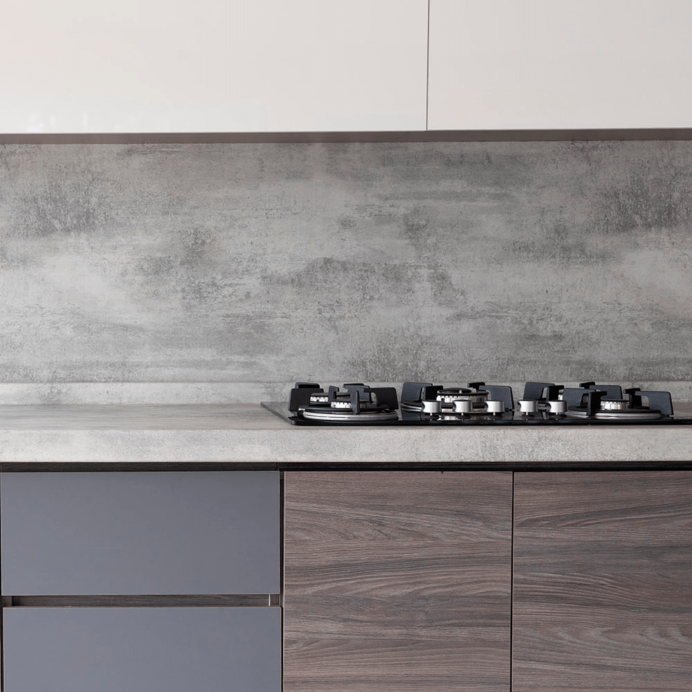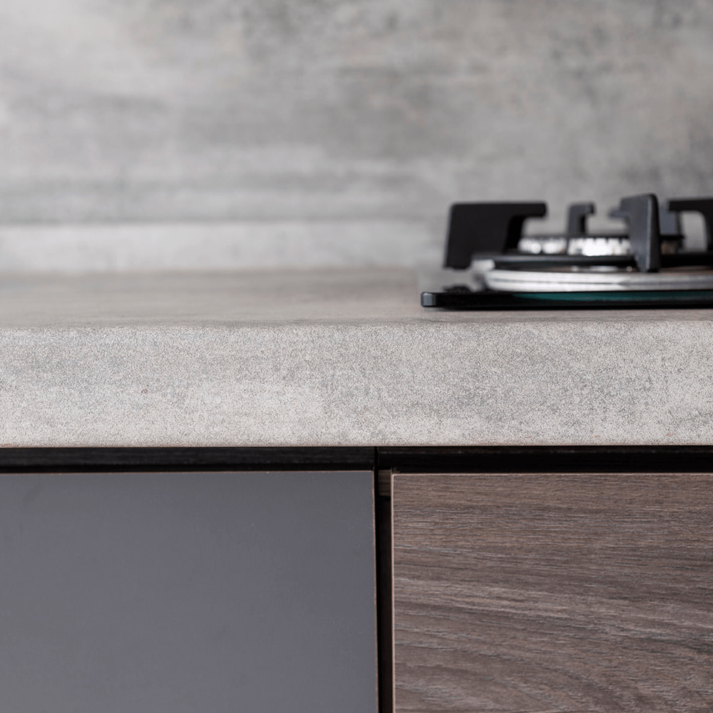 Cubierta para cocina Kober de estilo americano con respaldo integrado, línea Evolution perfil Essence, 100% impermeables evita filtraciones, libre de manchas, higiénicas, resistentes a la humedad. Bien instalada, y con ciertos cuidados como con cualquier otro tipo de cubierta, puede durar en excelente estado muchos años.