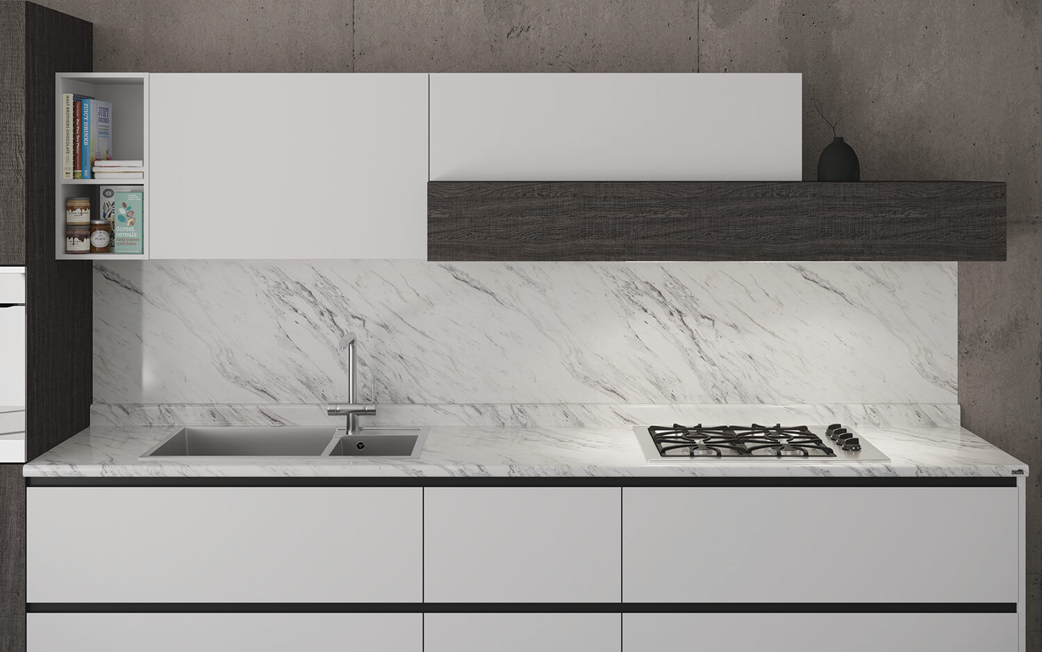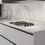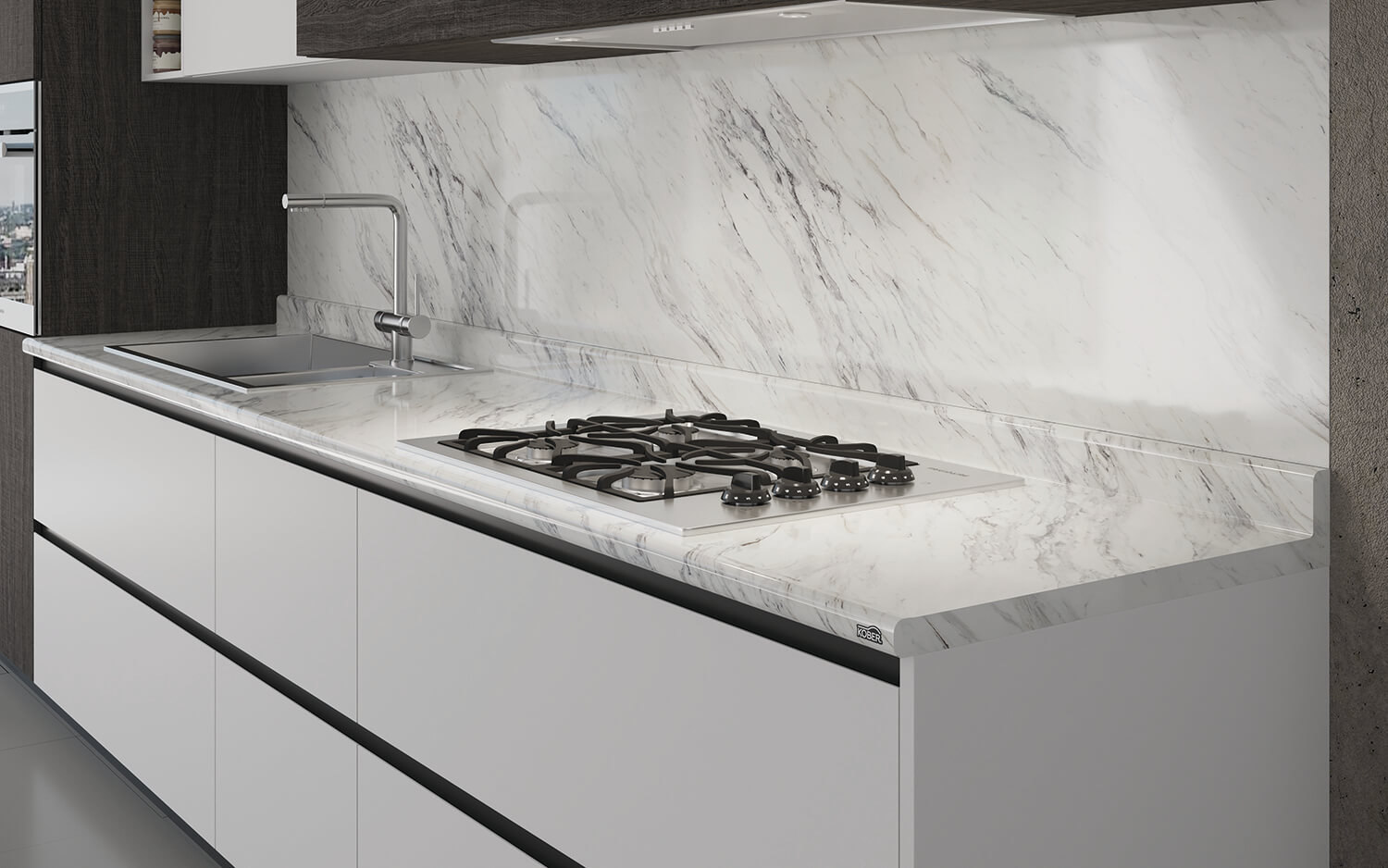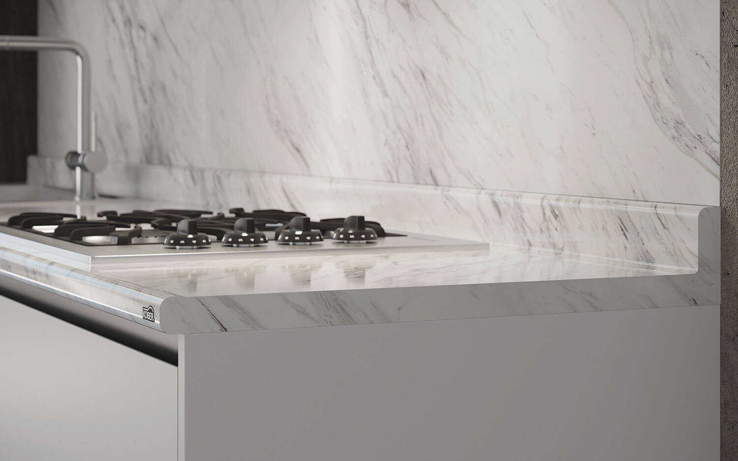 Cubierta para cocina Kober Basi-k. Disponible en un único perfil con borde antiderrame. De estética redondeada para diseños tradicionales.