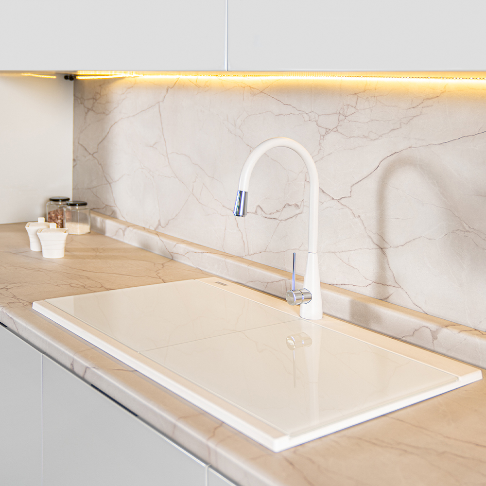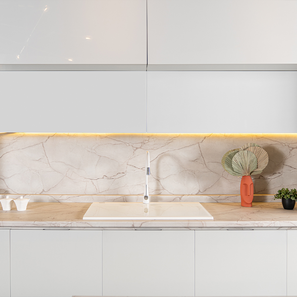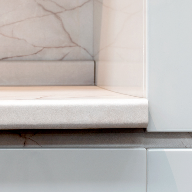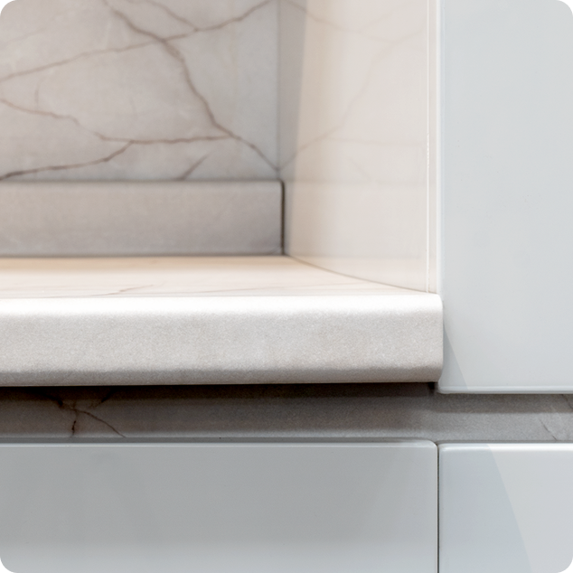 Cubierta para cocina Kober de estilo americano con respaldo integrado, línea Evolution perfil Original Q, 100% impermeables evita filtraciones, libre de manchas, higiénicas, resistentes a la humedad. Bien instalada, y con ciertos cuidados como con cualquier otro tipo de cubierta puede durar en excelente estado muchos años.